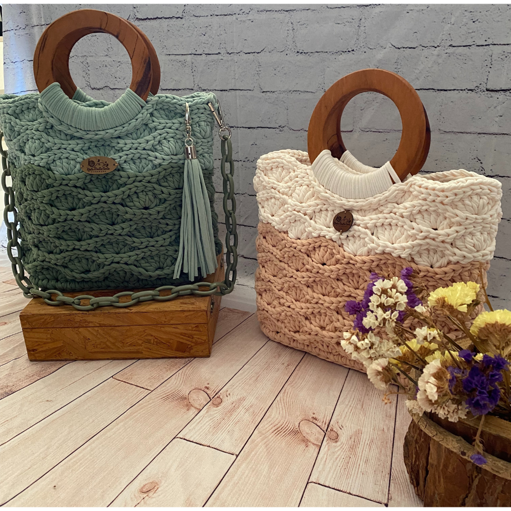 Confeccionada em Fio de Malha Premium, alças de madeira e fundo em couro sintético.