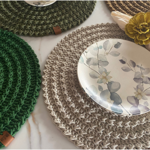 Sousplat confeccionado em fio de Poliéster, podendo ser adaptado para outros fios, como Malha ou Nautico.