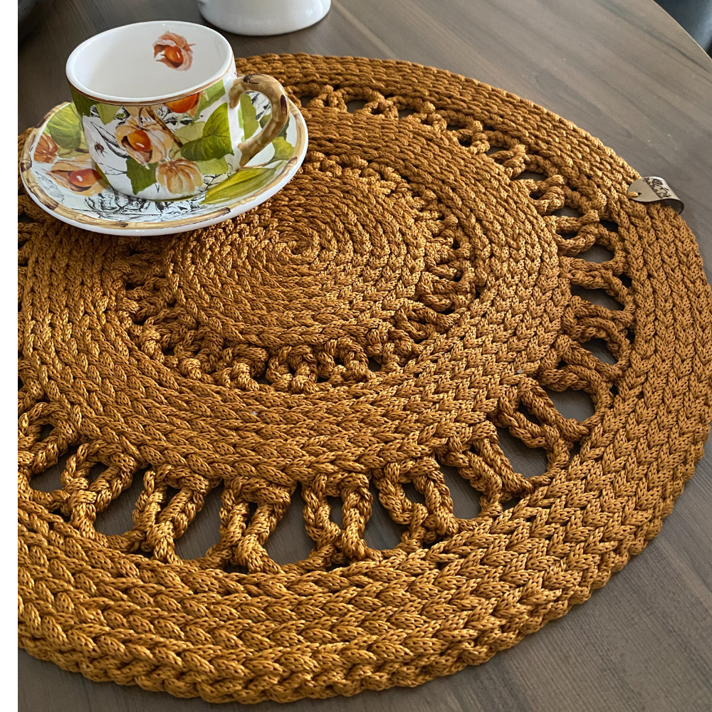 Sousplat confeccionado em fio de Poliéster, podendo ser adaptado para outros fios, como Malha ou Nautico.