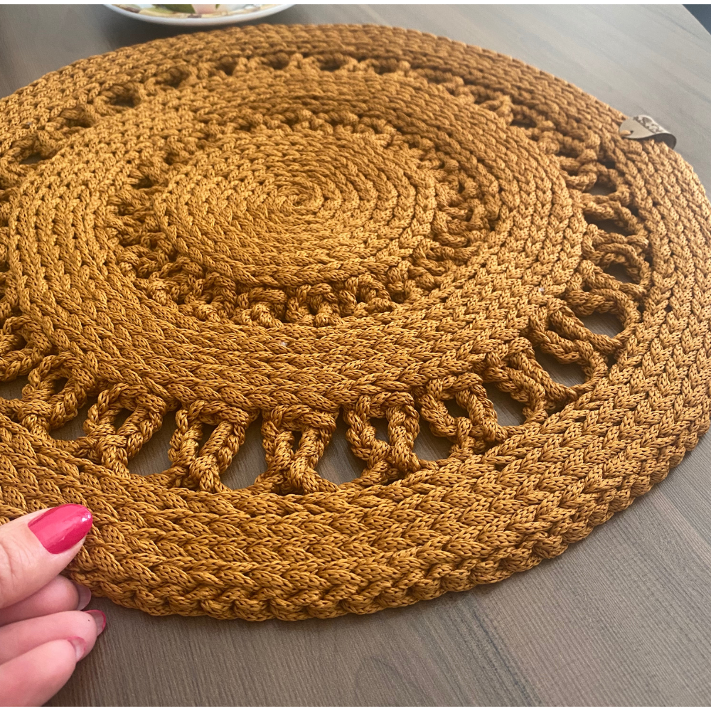 Sousplat confeccionado em fio de Malha, podendo ser adaptado para outros fios, como Poliéster ou Nautico.