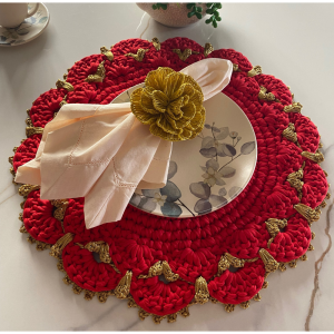 Sousplat com proposta Natalina confeccionado em Fio de Malha + Fio Encanto, podendo ser adaptado para outros fios e cores para ser usado no dia a dia.