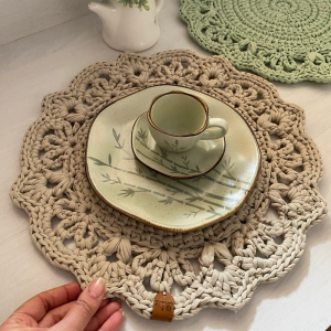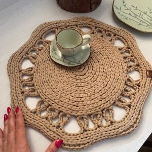 Sousplat confeccionado em fio de Poliéster, podendo ser adaptado para outros fios, como Malha ou Nautico.