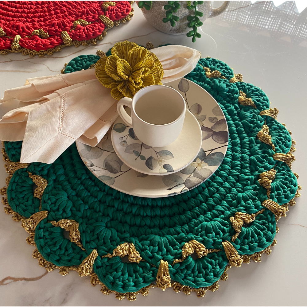 Sousplat confeccionado em fio de Malha, podendo ser adaptado para outros fios, como Poliéster ou Nautico.