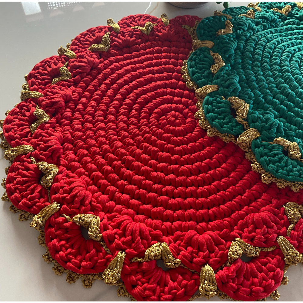 Sousplat com proposta Natalina confeccionado em Fio de Malha + Fio Encanto, podendo ser adaptado para outros fios e cores para ser usado no dia a dia.